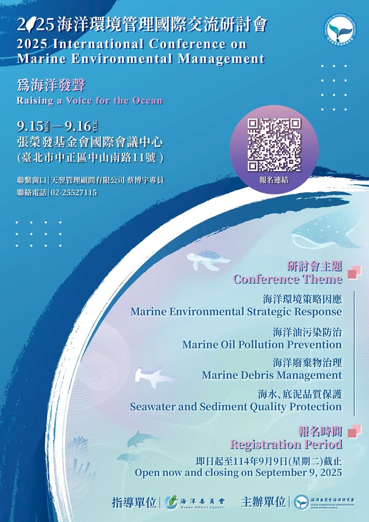 【2025 海洋環境管理國際研討會】海洋保育署將於 9/15-9/16 在臺北舉辦盛大的國際研討會啦