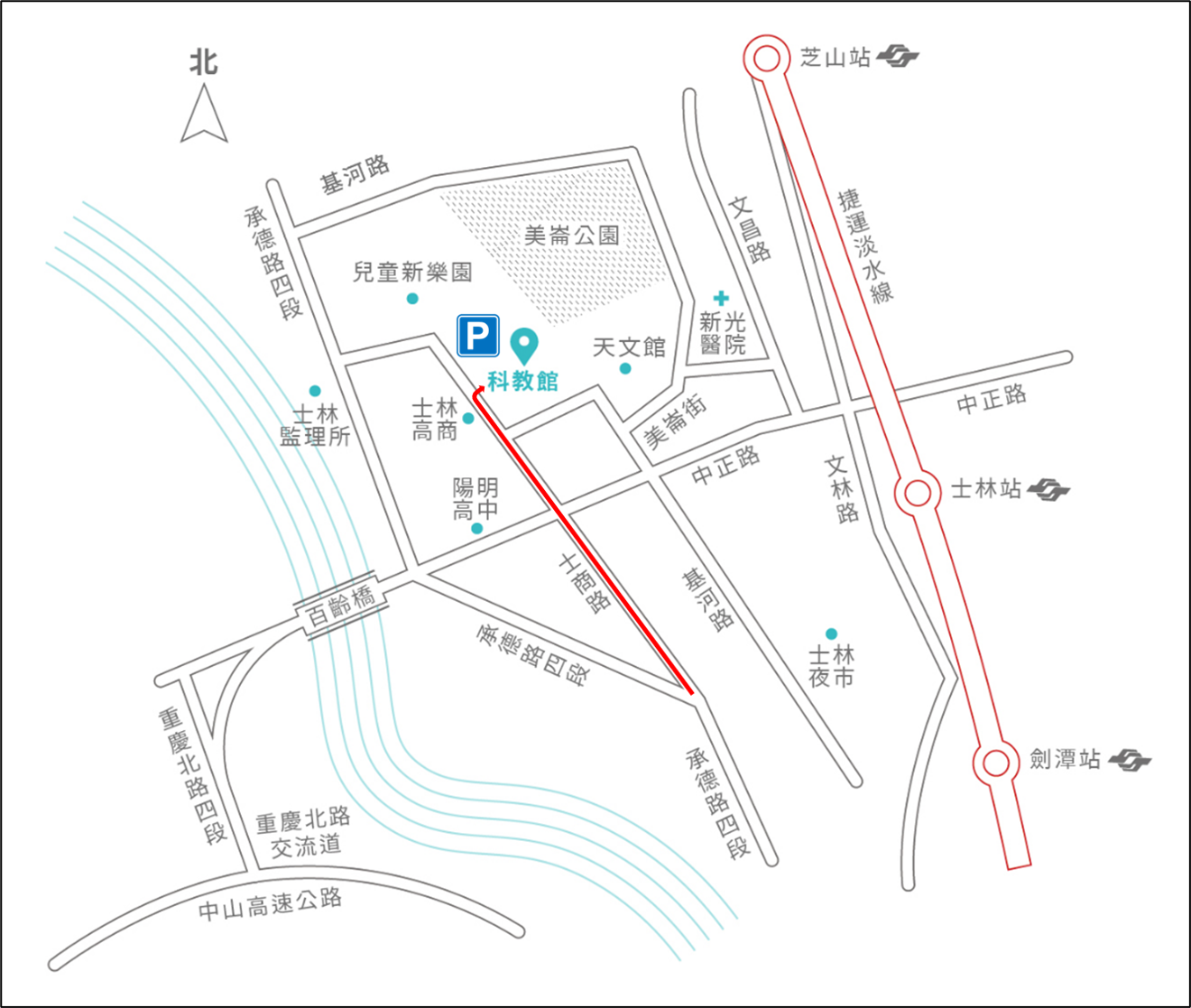 捷運士林站(1號出口過馬路)轉乘紅30(低地板公車)、紅12 或 557 至「國立科教館站」下車。
