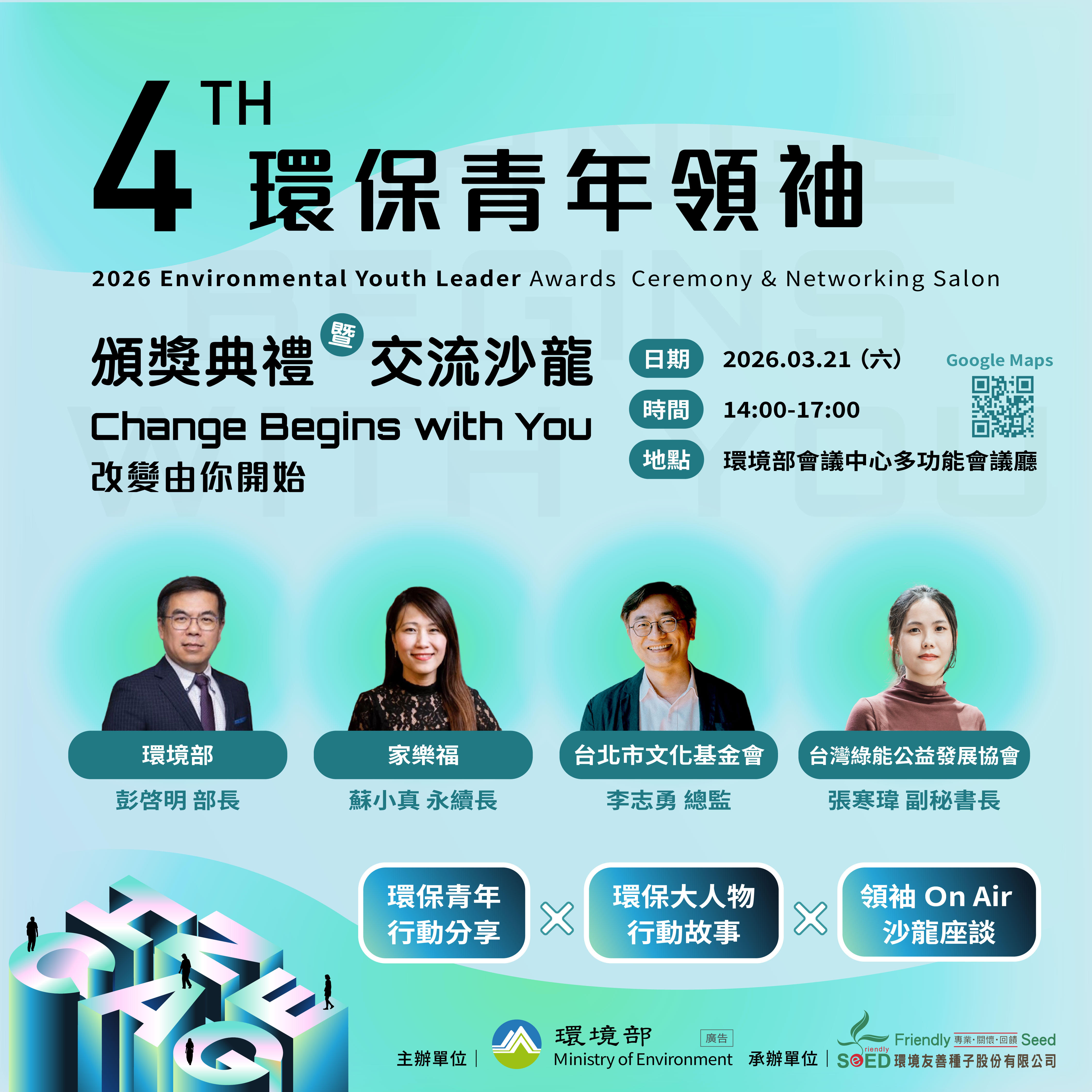 第 4 屆「環保青年領袖」頒獎典禮暨交流沙龍,我們不只頒獎, 更要開啟一場跨越想像的實戰對話!